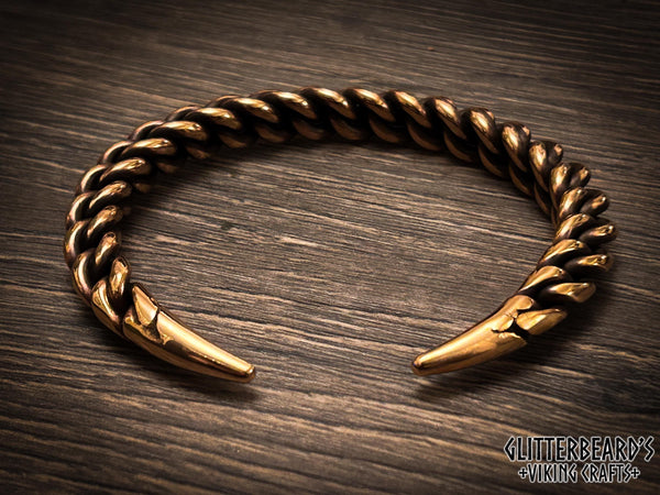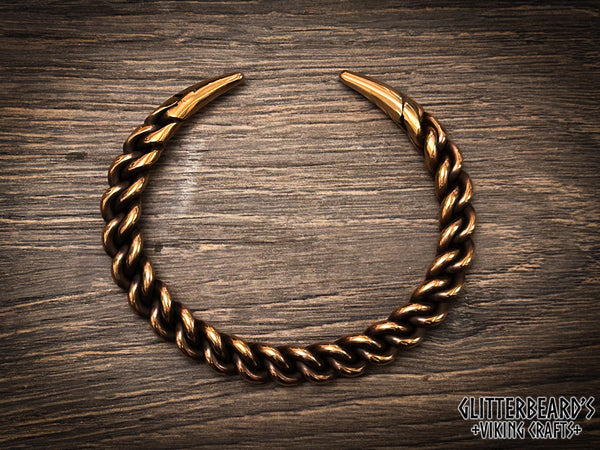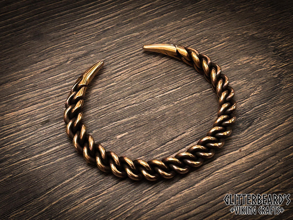 A Viking style arm ring, hand forged in bronze or sterling silver using concentric twists to create a triangular profile and woven pattern.