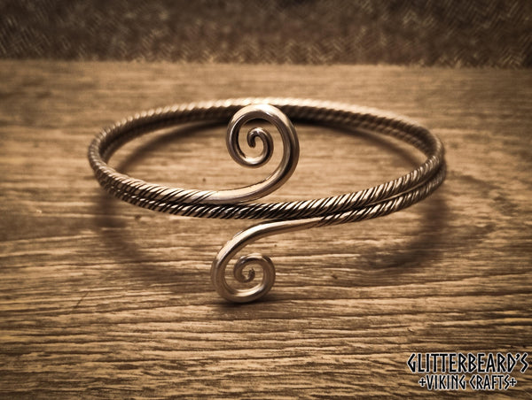 A Viking or Celtic upper arm ring, in twisted bronze or sterling silver, finished with curled ends and polished to a high shine.