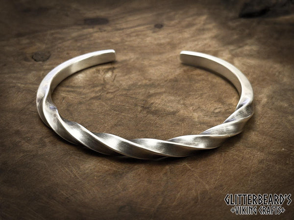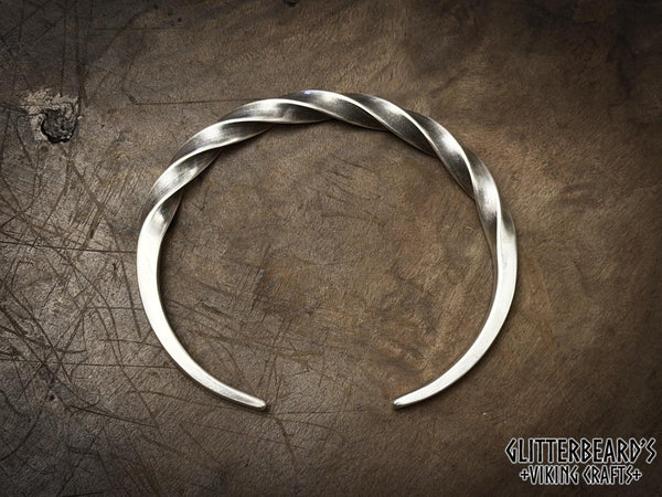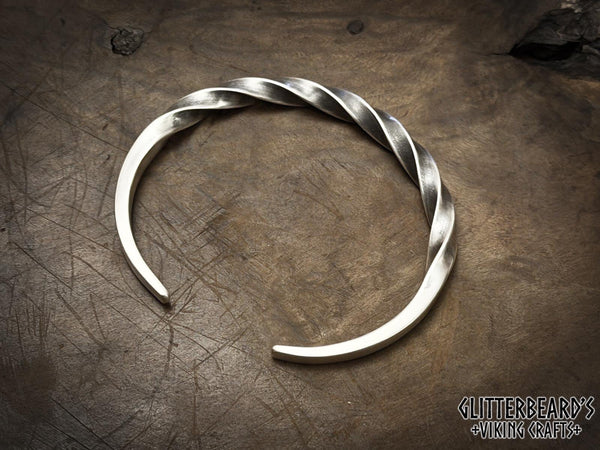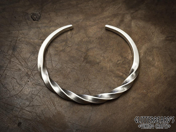 An authentic Viking style bracelet, hand forged from a solid bar of sterling silver into a twisted pattern with tapered ends. Based on finds from various viking-age silver hoards discovered in scandinavia and the british isles. These types of silver armrings were often worn as a sign of visible wealth and used as currency for bartering, known as hacksilver.