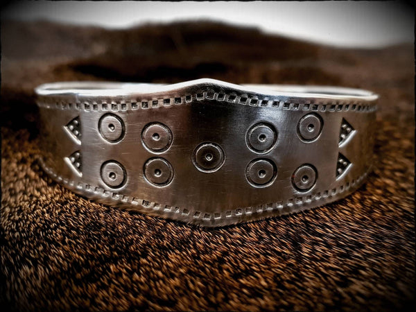 A viking style bracelet in lead-free pewter, brass or sterling silver. Hand decorated with authentic stamp-work and polished to a silver shine.