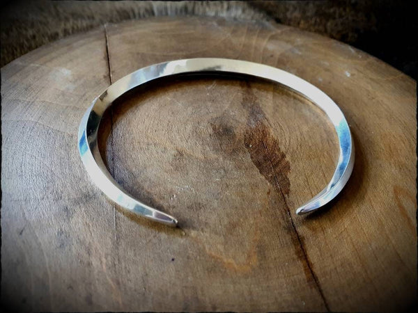 This bracelet is adjustable, and can be bent to fit using careful even pressure. Measures 20cm around, and is 7mm wide at the center, tapering to 4mm. Weighs approximately 35 grams.