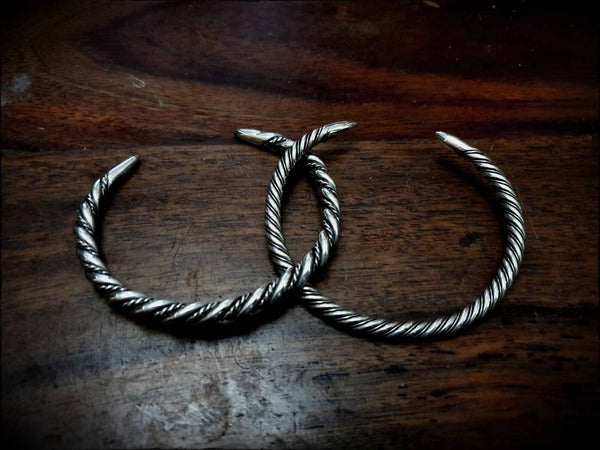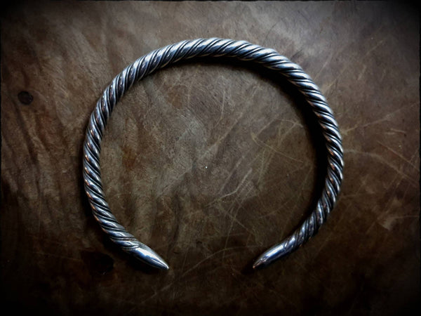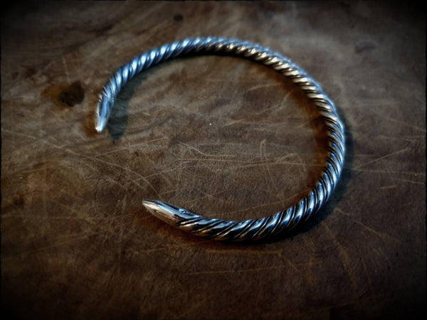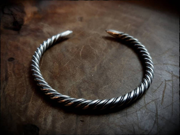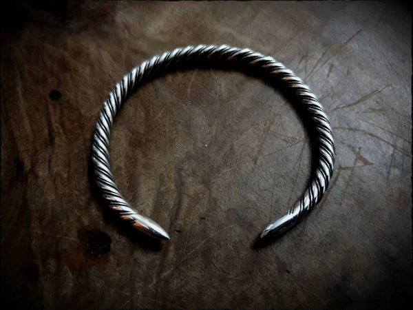 A Viking, Saxon or Celtic twisted wire bracelet, authentically hand forged from genuine sterling silver, finished with smooth pointed ends and polished to a high shine.