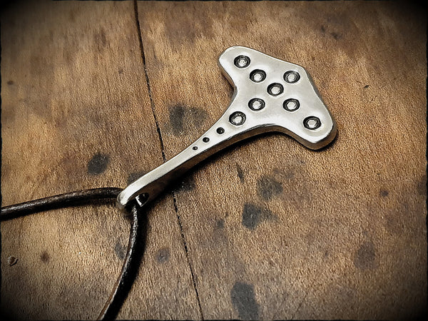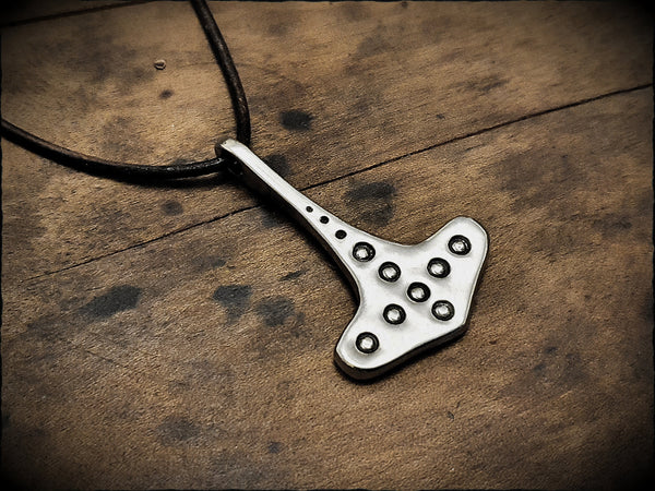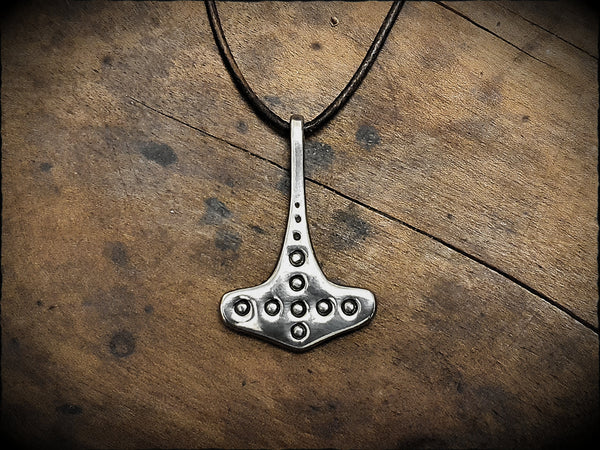 Mjolnir, Thor's Hammer, pendant based on an artifact originally found on Flekstad farm, central Norway. Cast in lead and nickel free pewter, bronze or sterling silver, authentically hand stamped and polished to a silver shine. Measures 45mm tall, 30mm wide, 3mm thick. Includes 1 meter leather cord ready to wear.