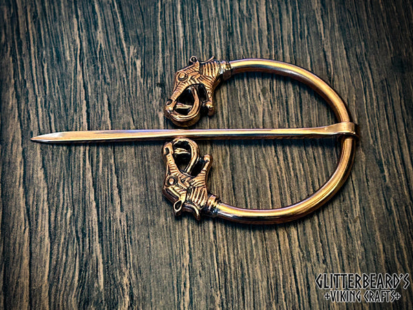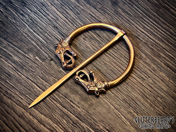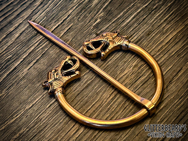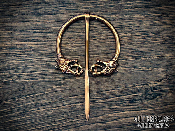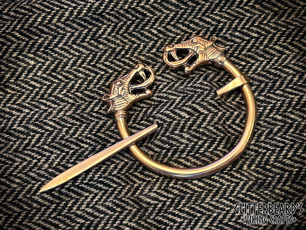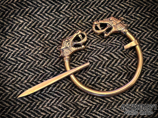 A Viking penannular brooch based on an original find from Vestland, Norway. Featuring cast dragon heads on a ring measuring 50mm x 50mm, the pin is 90mm long. Hand made in bronze or sterling silver and polished to a high shine.
