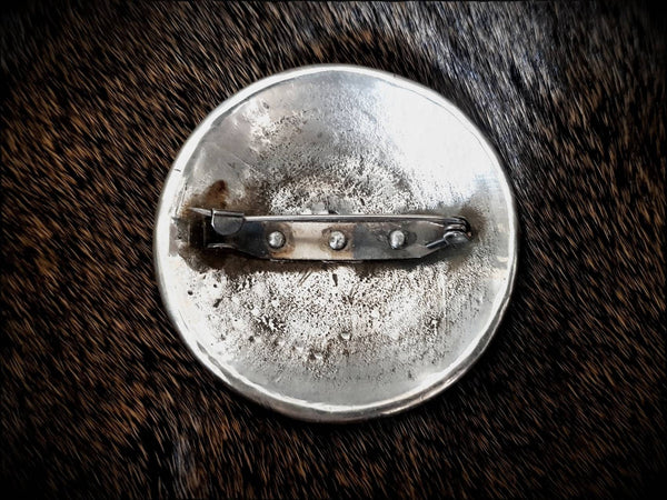 Fastened with a stainless steel pin. Measures 5cm in diameter.