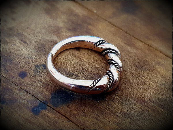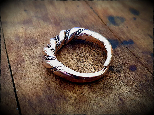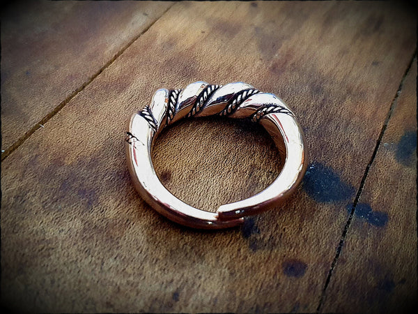 A large Norse or Celtic style twisted ring. Hand forged from traditional bronze and polished to a rich, glowing shine. Available in any size and both closed and open backed (adjustable). The band is 5.7mm wide at the front, 2mm at the back.