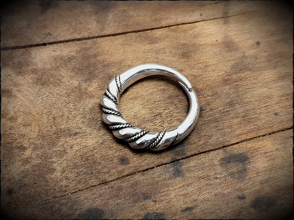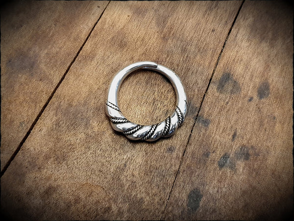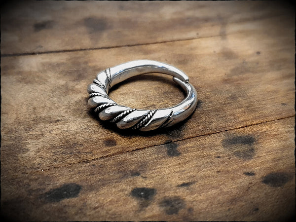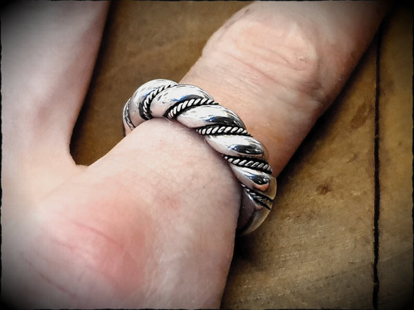 A large Norse or Celtic style twisted ring. Hand forged from solid .925 sterling silver. Available in any size and both closed and open backed (adjustable). The band is 5.7mm wide at the front, 2mm at the back.