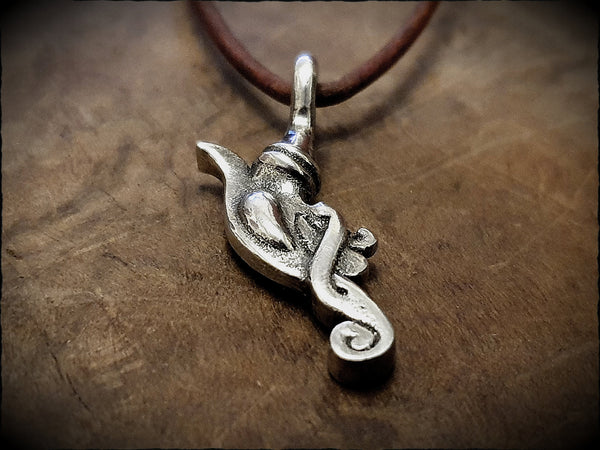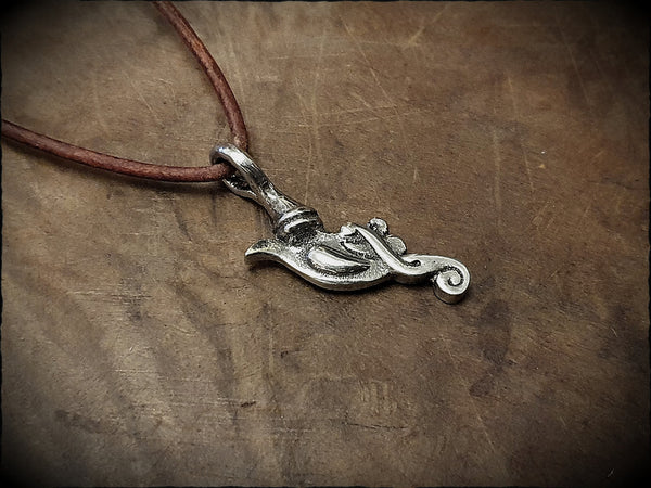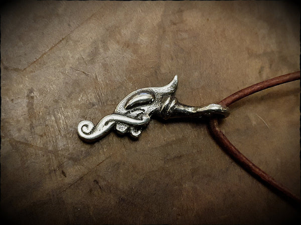 A Viking style dragon head pendant, based on the figurehead of the Helge Ask, a reproduction of the Skuldelev 5 warship found in Roskilde Fjord, Denmark. Hand cast in lead free pewter and polished to a silver shine. Measures approx 4cm x 2cm, includes leather cord ready to wear.