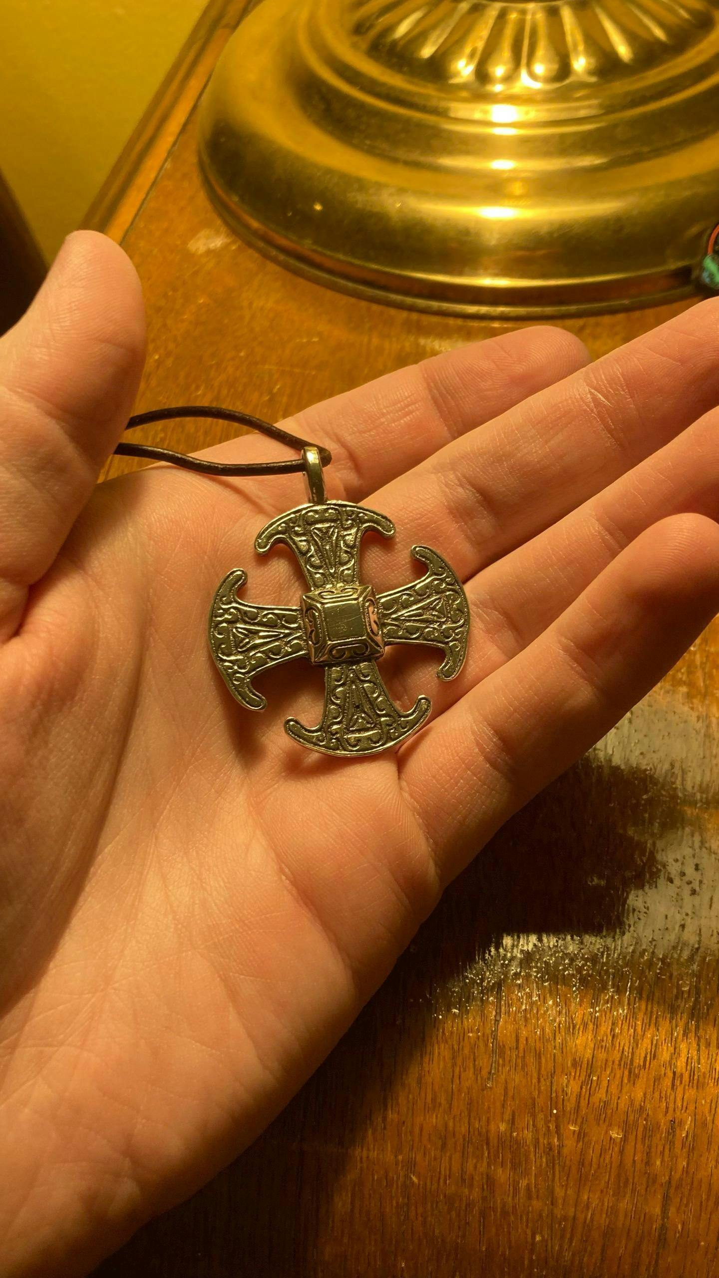 The Canterbury cross, an 8th century Anglo-Saxon brooch, reproduced here as a pendant in lead free pewter or sterling silver. Hand cast, detailed and polished to a silver shine.