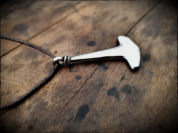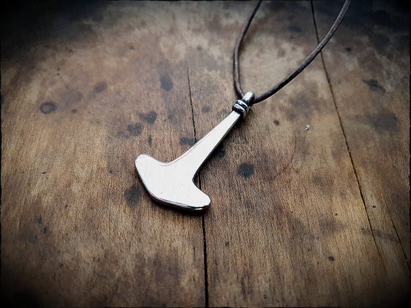 A traditional style Viking Mjolnir pendant, inspired by various finds around Scandinavia. Hand cast in lead and nickel free pewter and polished to a silver shine. Includes leather cord ready to wear. Measures 45mm tall, 25mm wide and 3mm thick.