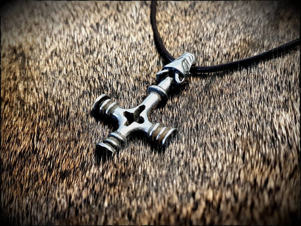 The wolf cross can be interpreted in two different ways: Either as a hammer symbolizing the norse god Thor, or as a Christian cross.