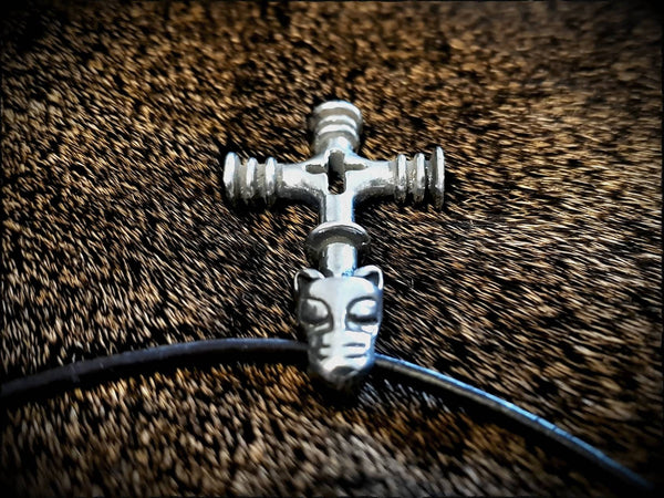 The famous wolf cross from Iceland, reproduced in lead free pewter. Hand cast, detailed and polished to a silver shine. Includes leather cord.