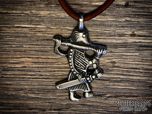 A viking pendant depicting a warrior with sword and axe, based on an artifact from Klahammar, Sweden. Hand cast in lead free pewter, bronze or sterling silver.