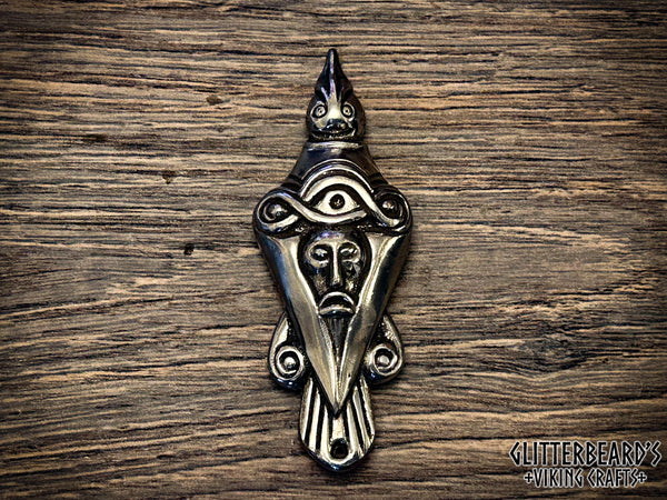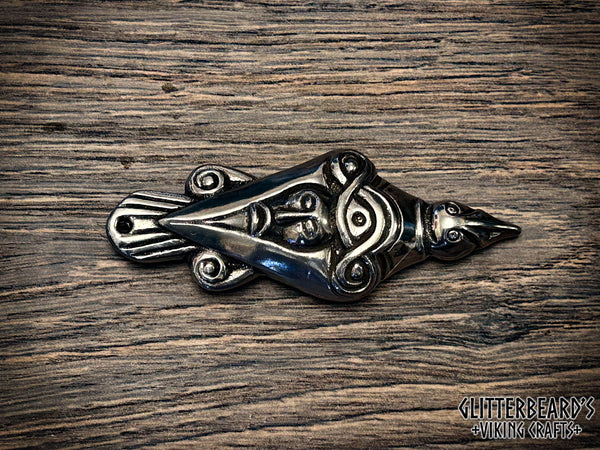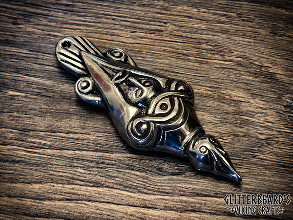 A viking raven brooch based on an artifact originally found in Uppåkra, Sweden. Hand cast in lead free pewter, bronze, or sterling silver, and polished to a glowing shine. Secured with a hinged back pin. Measures 80mm from beak to tail, 30mm wide.