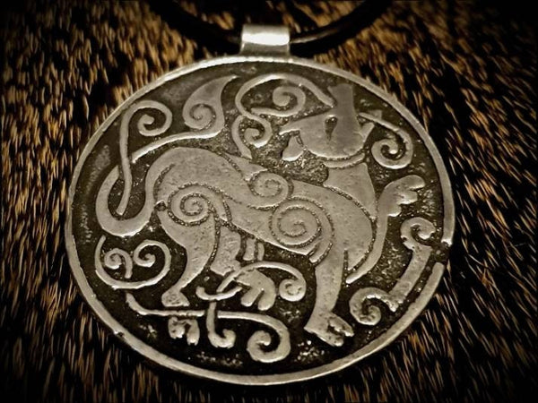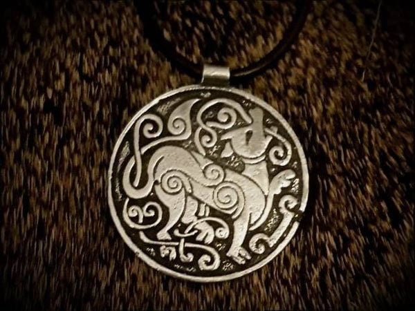 Viking pendant featuring a mammen-style depiction of the great wolf Fenrir who bit off Tyr's hand, and is destined to fight and kill Odin at Ragnarok.