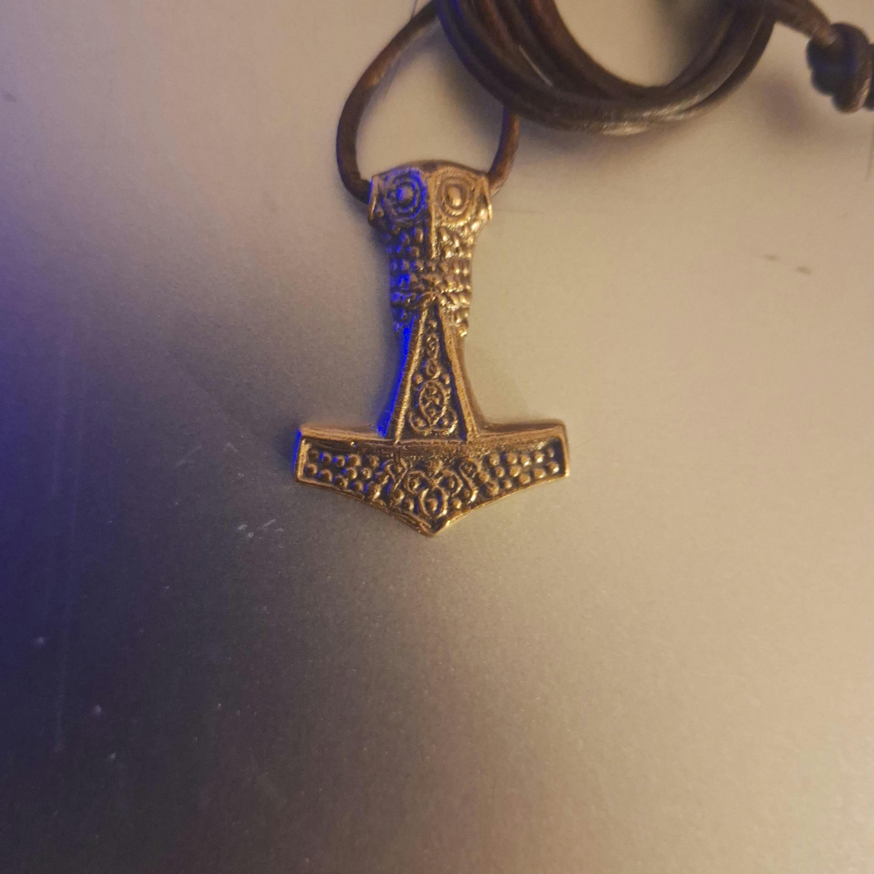 An authentic Viking Mjolnir pendant, based on a real artifact from Bredsättra, Sweden. Hand cast in lead free pewter, bronze or sterling silver. Pendant measures 40mm x 28mm, and inclused 1 meter leather cord.