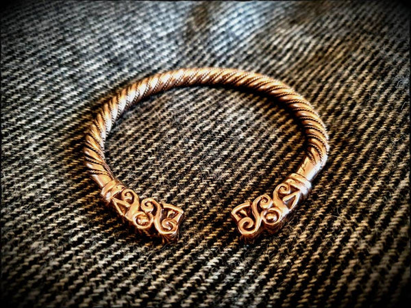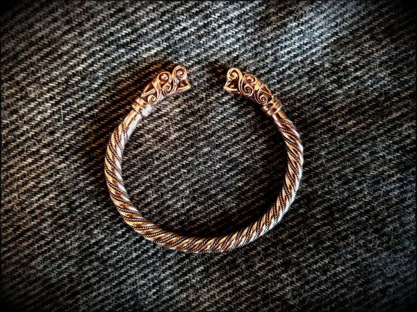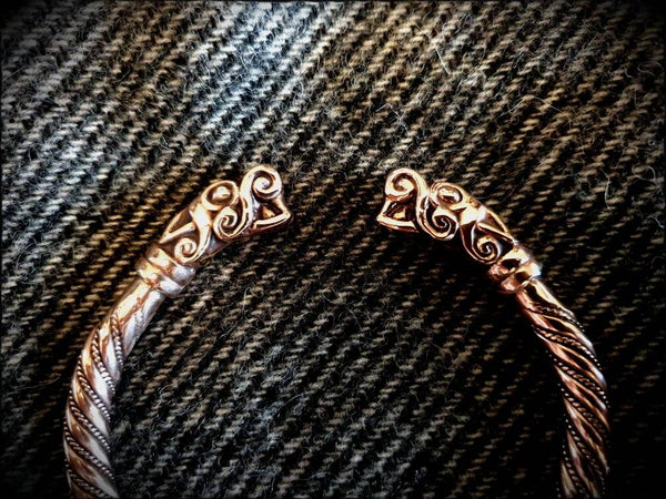 The ring is forged and twisted, then joined onto hand cast wolf head terminals, which are based on finds from Gotland (part of modern day Sweden). Detailed and polished to a high shine.