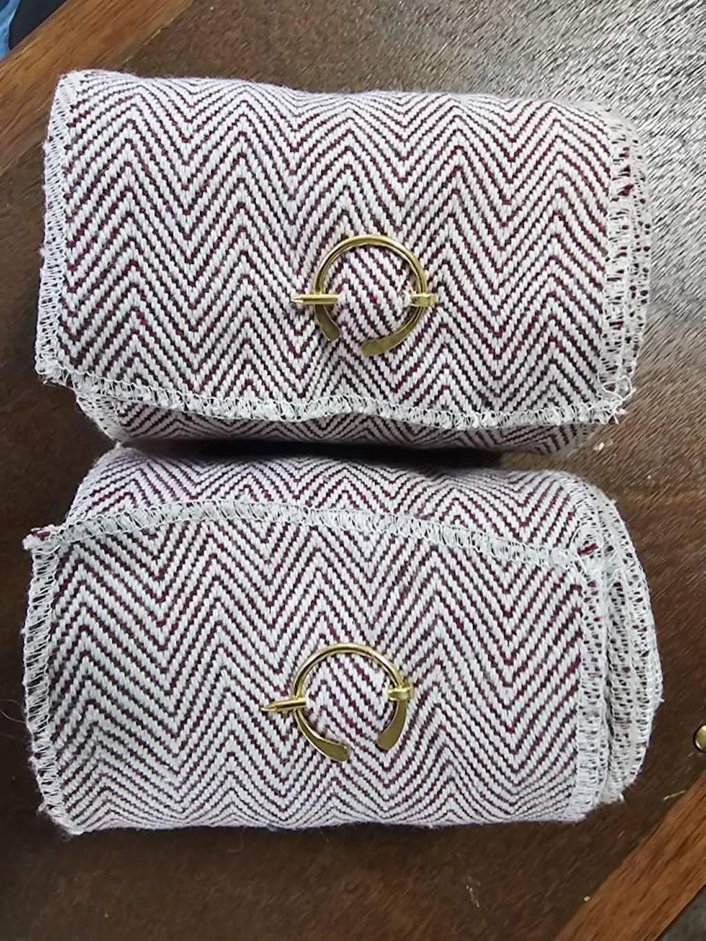 Miniature penannular pins, perfect for securing leg wraps, tunic closures, hat flaps, and many other applications in a Viking, Saxon or Celtic costume. Hand forged in brass and polished to a high shine. Measures approx 23mm diameter.