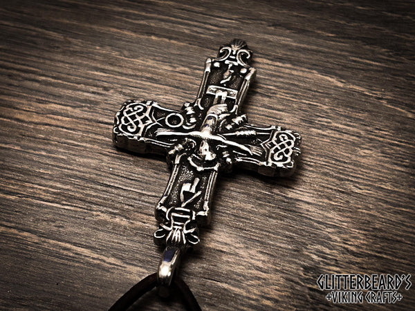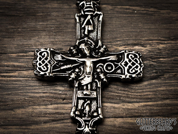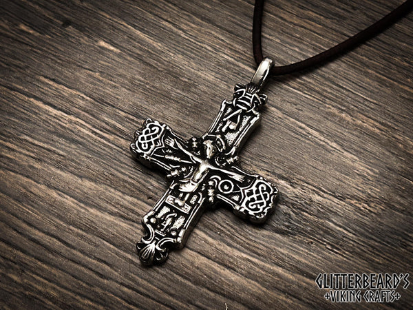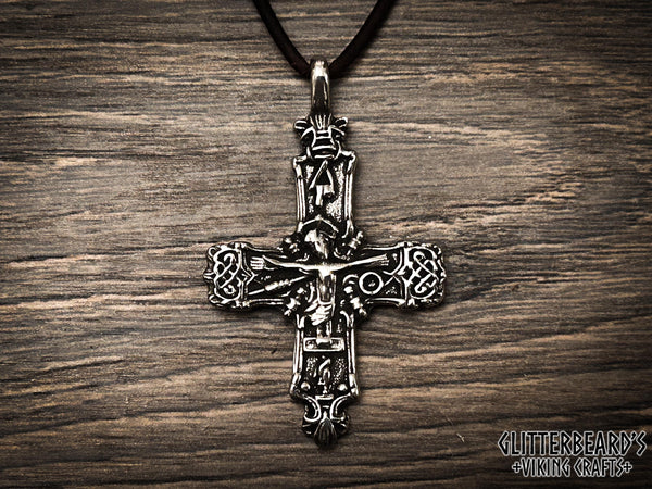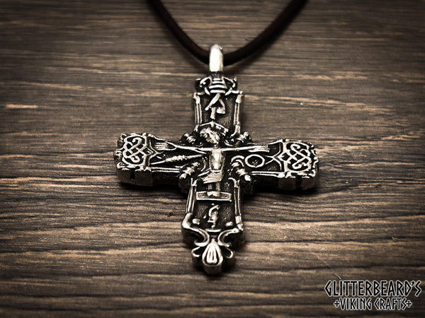 Handmade cross pendant based on an artifact found in Vestlolland, Denmark. Cast in lead free pewter, bronze or sterling silver, detailed and polished to a high shine. This cross measures 55mm x 35mm and includes 1 meter leather cord ready to wear.