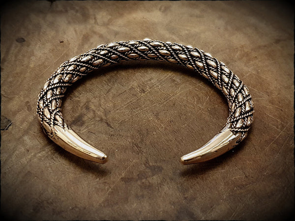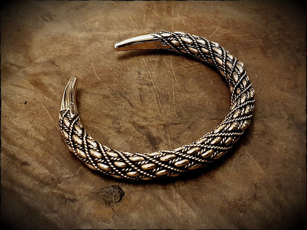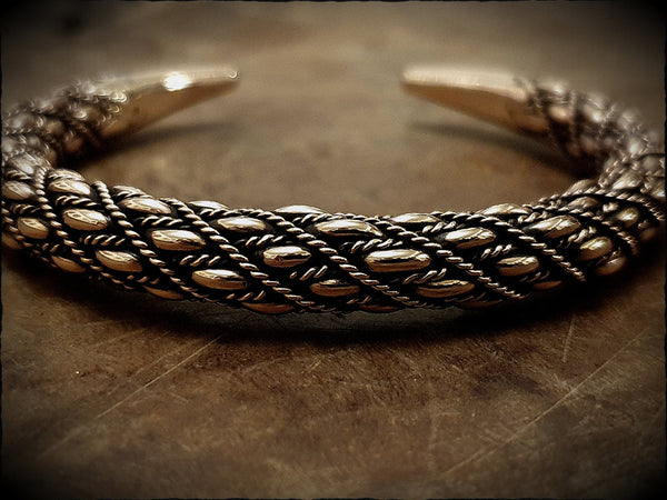 A viking bracelet of a complex design with interlocking braids. Hand forged from tradition bronze, detailed and polished to a warm glowing shine.