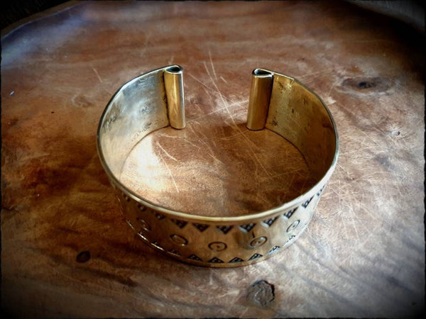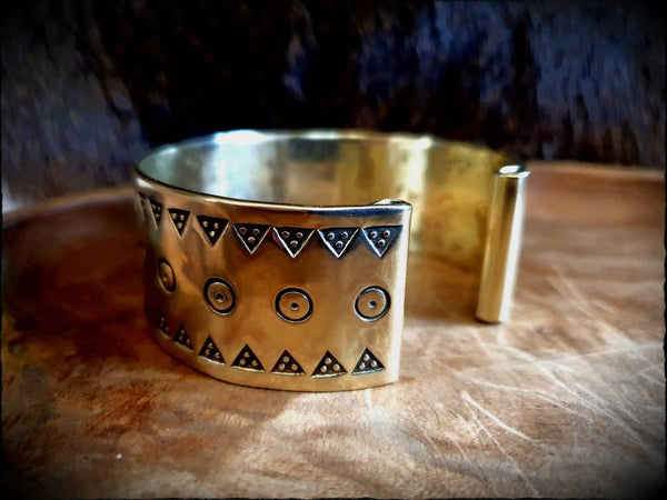 A Viking style bracelet, forged from brass or sterling silver, hand decorated with authentic stamp work and polished to a glowing shine.