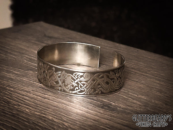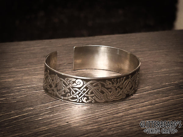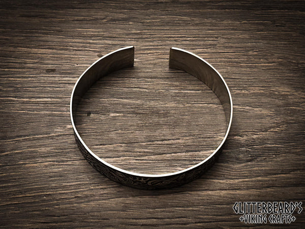 A handmade Viking bracelet forged from sterling silver or brass, etched, oxidised and polished to a shine. The band measures 19mm wide and 1mm thick. Adjustable and one size fits most, if you need a custom size please leave a note when ordering.