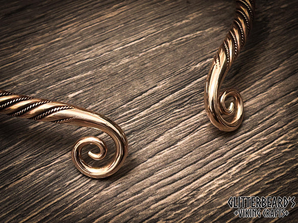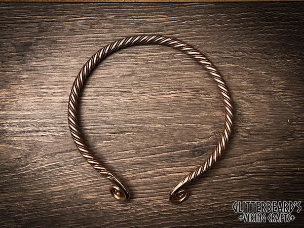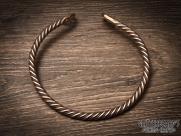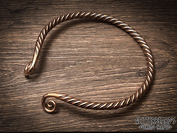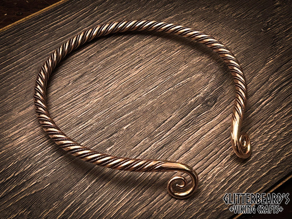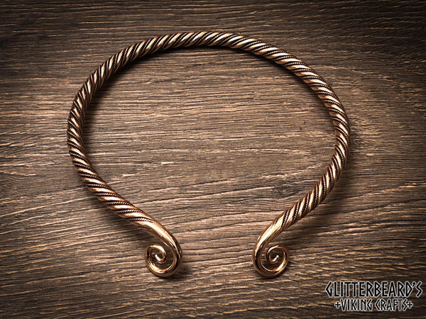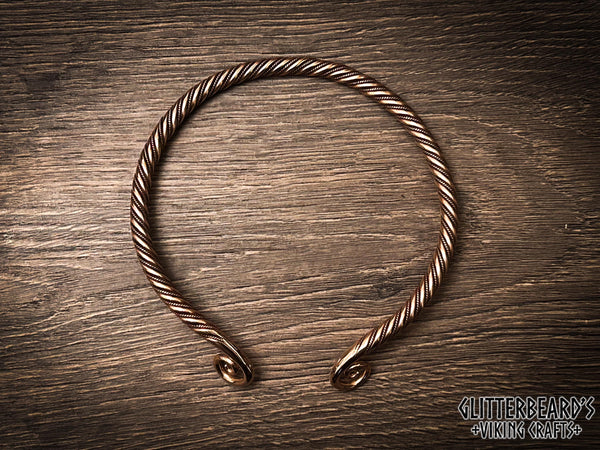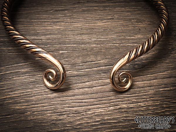 A Celtic Viking style neck torc, handmade from solid bronze or sterling silver, with spiral ends forged out from the same piece of metal.